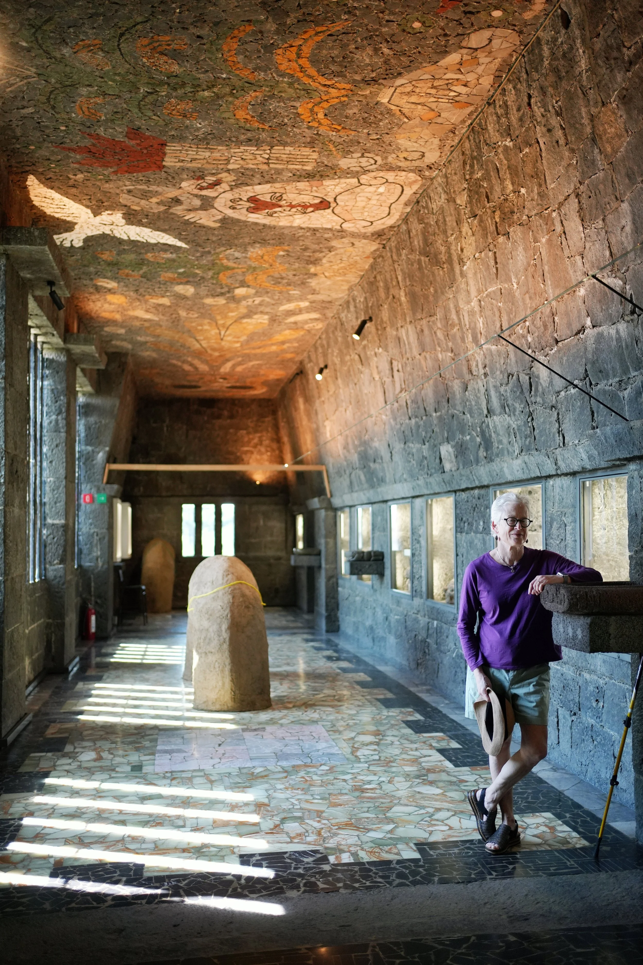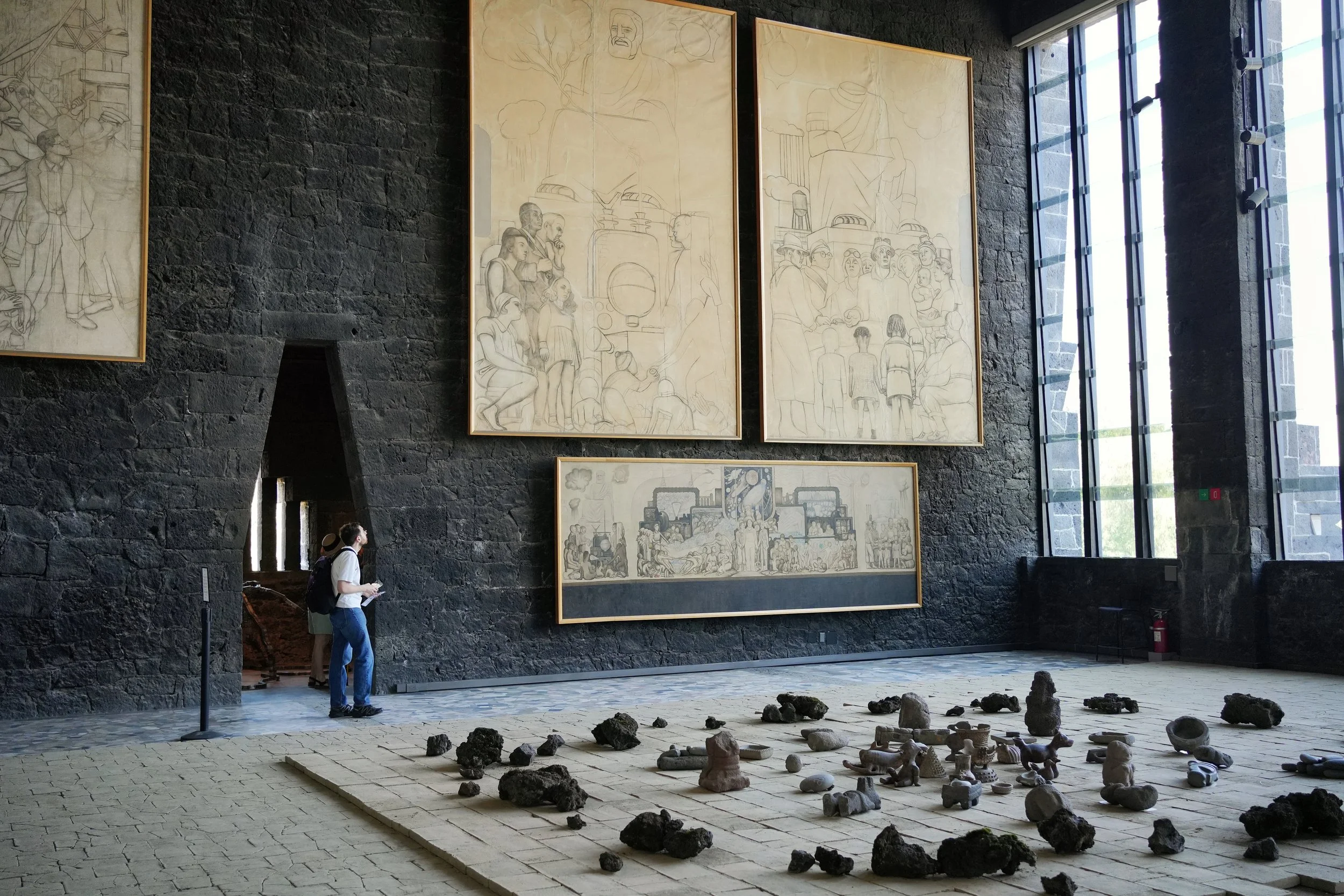 Every year, in accordance with Diego Rivera’s will, a contemporary art exhibit is presented on the premises. This exhibit must work harmoniously with the museum's architecture, with the pre-Columbian art on display, with the nature that surrounds it, and with the foundational and evolving concept of Diego's Anahuacalli. It is shown in the studio that houses sketches for Diego Rivera's murals, preparatory drawings that reveal his working method, the development of compositions, and the relationship between figure, space, and narrative. The photo below shows the current exhibit along with the sketches. Whatcha think?